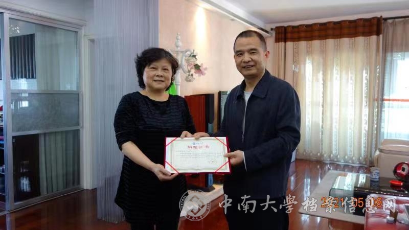 2021年5月8日,3044am永利集团官网档案馆原副馆长曹素平,无偿捐赠了私藏近40年之久的3件珍贵资料和部分原中南工业大学校史馆资料给学校档案馆。档案馆副馆长曹阳为捐赠者颁发捐赠证书。