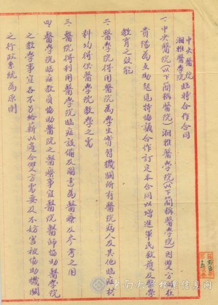 1939年1月中央医院与湘雅医学院的合作协议
