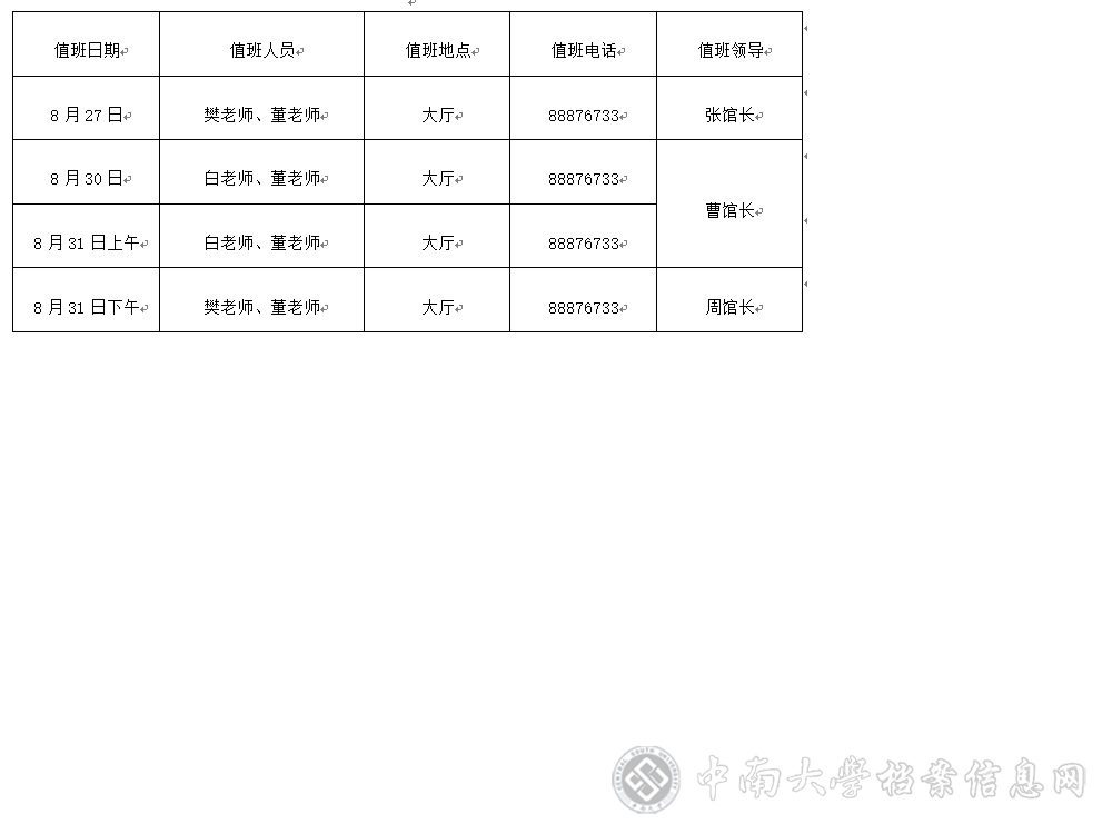 2021年8月27—31日,值班时间:上午:8:30-11:30,下午:3:00-5:00(周末、节假日除外)。